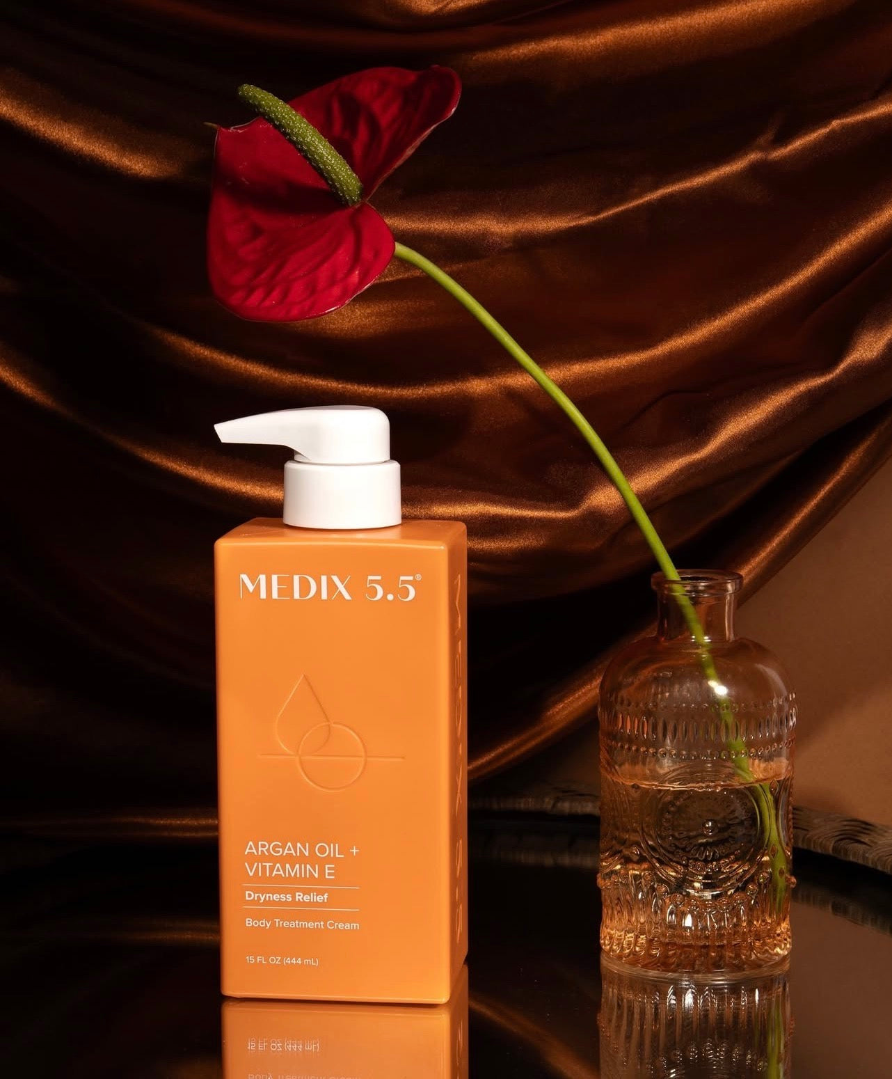 The Medix 5.5 Argan Oil + Vitamin E Dryness Relief Body Treatment Cream is a deeply hydrating and nourishing moisturizer designed to restore moisture to dry, dehydrated skin and improve its overall appearance. The formula is lightweight, non-greasy, and absorbs easily into the skin