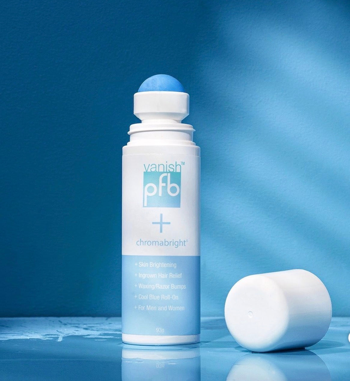 PFB Vanish + Chromabright is a roll-on serum designed to treat ingrown hairs, razor bumps, and dark spots (hyperpigmentation) caused by hair removal methods like shaving and waxing. It contains exfoliating acids (glycolic, salicylic, and lactic acids) and the patented brightening ingredient Chromabright.